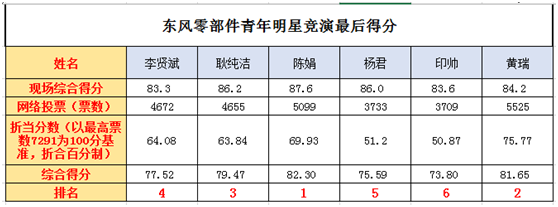 陳娟通過自我介紹、參與的項目與課題、獲得成果與榮譽、個人成長感悟等方面分享了自己在東風精鑄的成長故事。經過現(xiàn)場評委打分和現(xiàn)場觀眾打分,再結合網絡投票結果,最后獲得了本次竟演第一名的好成績。后續(xù)她還將代表東風零部件參加東風有限團委舉辦的“信賴青年”評比。讓我們一起預祝陳娟在后面的比賽中再創(chuàng)佳績。